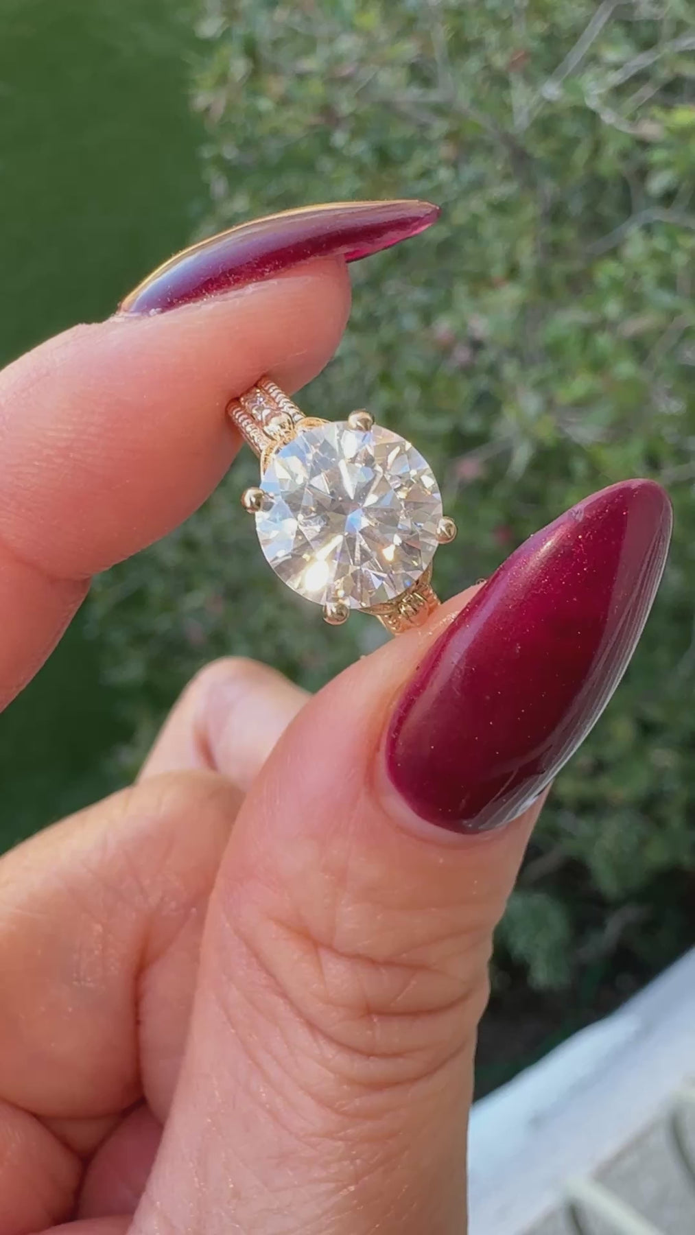 Bernice Round Center Stone Thick Shank Milgrain and Diamond Channel Cathedral Ring