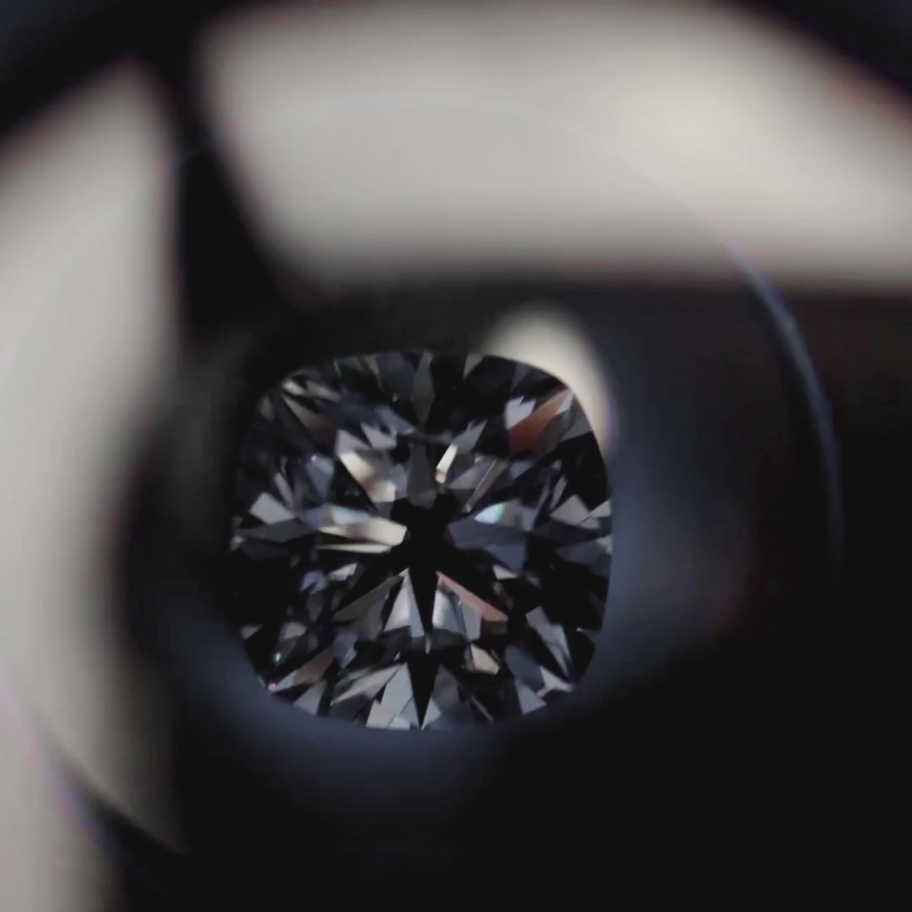 Fire & Brilliance's Cushion H&A FAB moissanite has a pillow-like resemblance with soft curves around the gemstone consisting of 77 precised facet placements to showcase light reflections of "Hearts & Arrows."