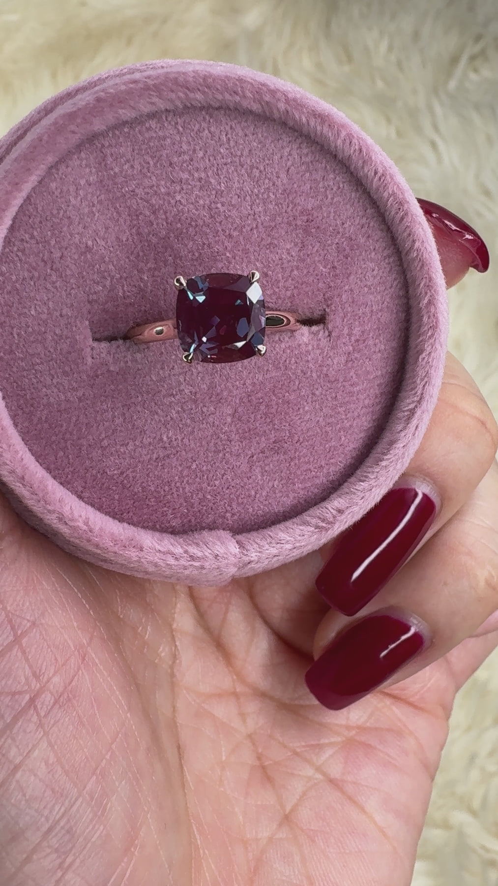 Janey Cushion Alexandrite 4 Prongs Claw Floating Halo Inverted Cathedral Ring